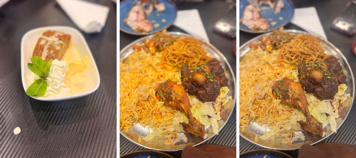 Definitely try the platter for its generous portion size, full of flavors, and don't miss the Date Cake for dessert—it perfectly balances sweetness and savoriness.